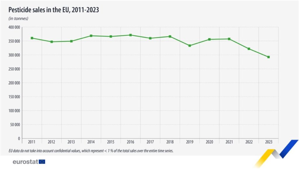 Το 2023 πωλήθηκαν στην ΕΕ περίπου 292 000 τόνοι φυτοφαρμάκων, το χαμηλότερο επίπεδο από την έναρξη της σειράς στοιχείων το 2011. Αυτό σηματοδότησε μείωση 9% σε σύγκριση με το 2022 και πτώση 18% σε σύγκριση με το 2021.