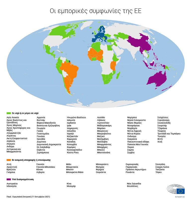 Το 2020, η ΕΕ ήταν δεύτερη σε εξαγωγές αγαθών στον κόσμο (15%) μετά την Κίνα (18%), αλλά πριν τις ΗΠΑ (10%). Ήταν, επίσης για το 2020, ο τρίτος μεγαλύτερος εισαγωγέας αγαθών (13%) μετά τις ΗΠΑ (16%) και την Κίνα (14%). Οι νέες συμφωνίες δημιουργούν νέες επιχειρηματικές ευκαιρίες για τις ευρωπαϊκές επιχειρήσεις, δημιουργούν νέες θέσεις εργασίας και δημιουργούν χαμηλότερες τιμές και περισσότερη ποικιλία για τους καταναλωτές.