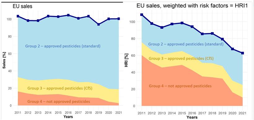 Η ομαδοποίηση αντιστοιχεί στο τρέχον καθεστώς έγκρισης των φυτοφαρμάκων το 2021. Τόσο τα στοιχεία πωλήσεων (αριστερά) όσο και ο κίνδυνος HRI1 (δεξιά) δίνονται ως ποσοστά σε σχέση με την περίοδο αναφοράς 2011-2013. Το ποσοστό της ομάδας 1 είναι < 0,01% και επομένως δεν είναι εμφανές γραφικά.