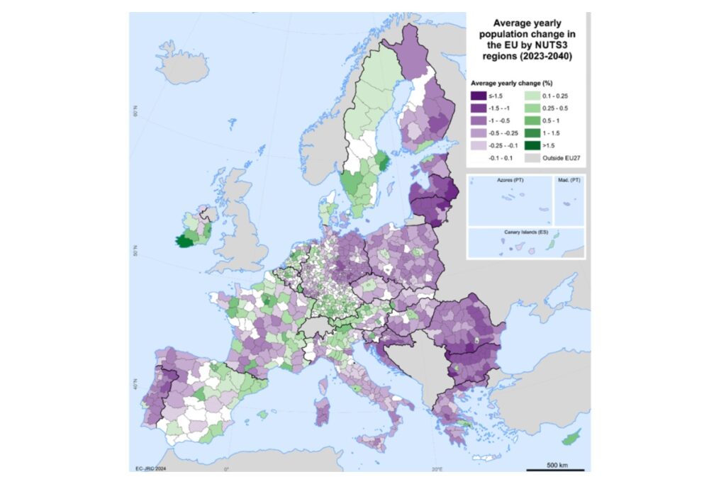 Συνολικά, ο πληθυσμός της ΕΕ προβλέπεται να μειώνεται κατά σχετικά μέτριο ποσοστό 0,04% ετησίως έως το 2040. Ωστόσο, οι προβολές ποικίλλουν ανά χώρα και ανά εδαφική τυπολογία. Οι ανατολικές χώρες της ΕΕ αναμένεται να παρουσιάσουν την πιο έντονη μείωση, με τους πληθυσμούς της Λετονίας και της Λιθουανίας να συρρικνώνονται κατά σχεδόν 1%, ενώ η υψηλότερη αύξηση του πληθυσμού αναμένεται στη Μάλτα, την Ιρλανδία, το Λουξεμβούργο, την Κύπρο και τη Σουηδία, με μέσους ετήσιους ρυθμούς αύξησης άνω του 0,5%.