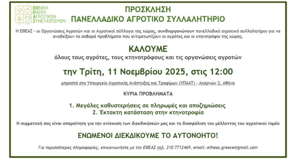 Η διαμαρτυρία αποφασίστηκε να πραγματοποιηθεί την Τρίτη, 11 Νοεμβρίου, στις 12:00, στο Υπουργείο Αγροτικής Ανάπτυξης και Τροφίμων, με τη συμμετοχή αγροτικών συνεταιρισμών, αγροτικών συλλόγων, ομοσπονδιών, παραγωγών και κτηνοτρόφων από όλη τη χώρα.