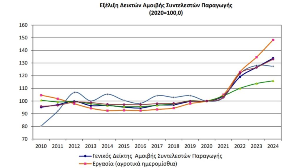 Η εξέλιξη του Γενικού Δείκτη Αμοιβής Συντελεστών Παραγωγής στη Γεωργία – Κτηνοτροφία, για το έτος 2024, έχει ως εξής: