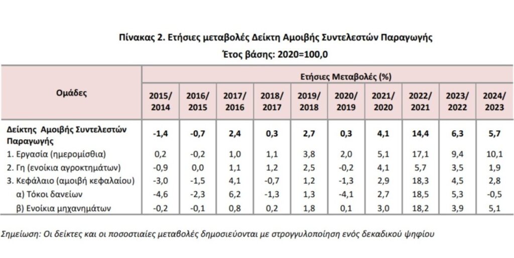 Η μεταβολή του Γενικού Δείκτη Αμοιβής Συντελεστών Παραγωγής στη Γεωργία – Κτηνοτροφία (αύξηση 5,7%) το έτος 2024, σε σύγκριση με τον Γενικό Δείκτη του έτους 2023, οφείλεται στις ακόλουθες μεταβολές των επιμέρους δεικτών: