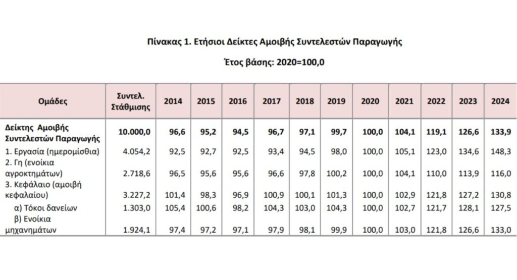 Η Ελληνική Στατιστική Αρχή (ΕΛΣΤΑΤ) ανακοίνωσε τους ετήσιους Δείκτες Αμοιβής Συντελεστών Παραγωγής (ΑΣΠ) στη Γεωργία – Κτηνοτροφία, για το έτος 2024.