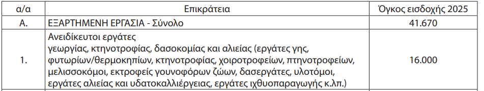 α) Εξαρτημένη εργασία ανέρχεται σε 41.670, εκ των οποίων οι 16.000 θα είναι ανειδίκευτοι εργάτες γεωργίας, κτηνοτροφίας, δασοκομίας και αλιείας (εργάτες γης, φυτωρίων/θερμοκηπίων, κτηνοτροφίας, χοιροτροφείων, πτηνοτροφείων, μελισσοκόμοι, εκτροφείς γουνοφόρων ζώων, δασεργάτες, υλοτόμοι, εργάτες αλιείας και υδατοκαλλιέργειας, εργάτες ιχθυοπαραγωγής κ.λπ.)