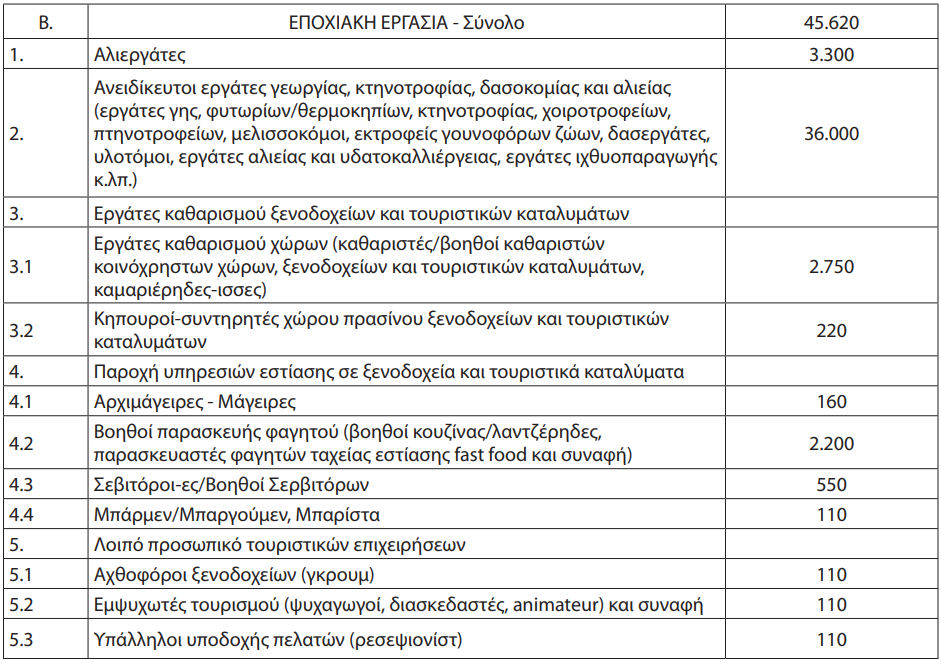 β) Εποχιακή εργασία ανέρχεται σε 45.620, εκ των οποίων οι 36.000 θα είναι ανειδίκευτοι εργάτες γεωργίας, κτηνοτροφίας, δασοκομίας και αλιείας (εργάτες γης, φυτωρίων/θερμοκηπίων, κτηνοτροφίας, χοιροτροφείων, πτηνοτροφείων, μελισσοκόμοι, εκτροφείς γουνοφόρων ζώων, δασεργάτες, υλοτόμοι, εργάτες αλιείας και υδατοκαλλιέργειας, εργάτες ιχθυοπαραγωγής κ.λπ.) και οι 3.300 αλιεργάτες.