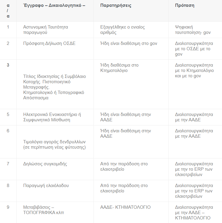 Πίνακας με 9 ενδεικτικές παρατηρήσεις και προτάσεις για τα δικαιολογητικά που ζητούνται για το ελαιοκομικό μητρώο από τις ΔΑΟΚ με βάση την υπουργική απόφαση