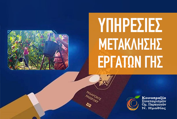 Η Κοινοπραξία Συνεταιρισμών Ο.Π. Ημαθίας ενημερώνει τους αγρότες ότι στα γραφεία της λειτουργεί τμήμα υποστήριξης της διαδικασίας για τη μετάκληση εργατών γης από Αλβανία, Ινδία, Ταϊλάνδη, Βιετνάμ και άλλες χώρες, ενώ παράλληλα διεκπεραιώνονται και αιτήσεις άδειας διαμονής κάθε τύπου.