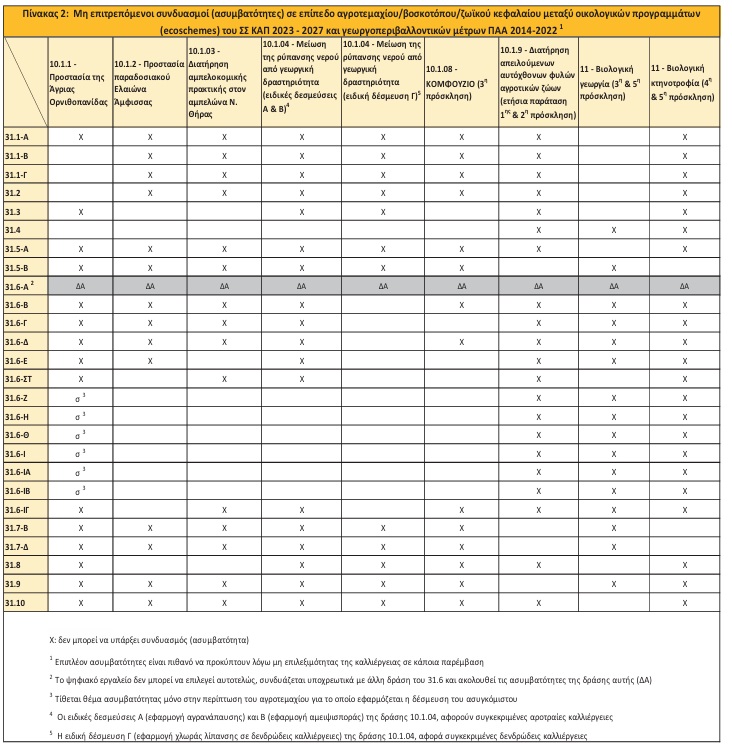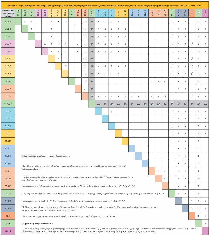 Ο πίνακας 1 «Μη επιτρεπόμενοι συνδυασμοί (ασυμβατότητες) σε επίπεδο αγροτεμαχίου μεταξύ των δράσεων των οικολογικών προγραμμάτων (ecoschemes) του ΣΣ ΚΑΠ 2023 – 2027» και ο πίνακας 2 «Μη επιτρεπόμενοι συνδυασμοί (ασυμβατότητες) σε επίπεδο αγροτεμαχίου/ζωϊκού κεφαλαίου μεταξύ οικολογικών προγραμμάτων (ecoschemes) του ΣΣ ΚΑΠ 2023 – 2027 και γεωργοπεριβαλλοντικών μέτρων ΠΑΑ 2014-2022» αυτού, αντικαθίσταται ως ακολούθως: