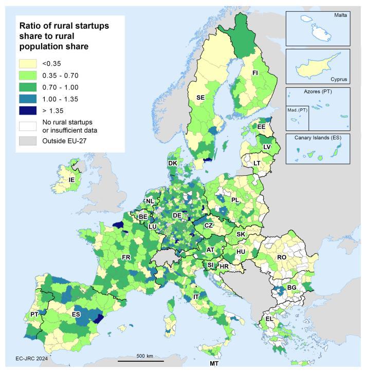 Ωστόσο, ορισμένες αγροτικές περιοχές παρουσιάζουν αξιοσημείωτες επιδόσεις. Σε περιφέρειες όπως το Val-d’Oise (Γαλλία), το Alb-Donau-Kreis στη Βάδη-Βυρτεμβέργη (Γερμανία) και η επαρχία Imperia (Ιταλία), το μερίδιο των αγροτικών νεοσύστατων επιχειρήσεων είναι πολύ υψηλότερο από τον εθνικό μέσο όρο σε σύγκριση με το μερίδιο του αγροτικού πληθυσμού. Αυτό δείχνει πώς οι αγροτικές περιοχές μπορούν να καλλιεργήσουν καινοτόμες δραστηριότητες υπό τις κατάλληλες τοπικές συνθήκες.