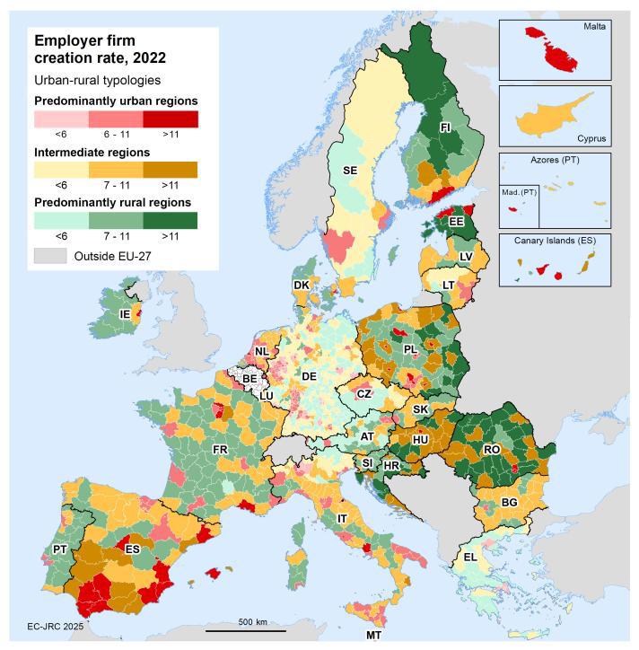 Το 2022, 59 αγροτικές περιφέρειες στην Εσθονία, τη Ρουμανία, την Ουγγαρία, την Κροατία, την Πολωνία και τη Φινλανδία ανέφεραν ποσοστά δημιουργίας επιχειρήσεων πολύ υψηλότερα από τον μέσο όρο του 9,4% της ΕΕ. Σε άλλες χώρες, οι αγροτικές περιφέρειες είχαν παρόμοιες επιδόσεις με τις αστικές περιοχές της ίδιας χώρας – για παράδειγμα στην Ουγγαρία, την Ιταλία και τη Λετονία.