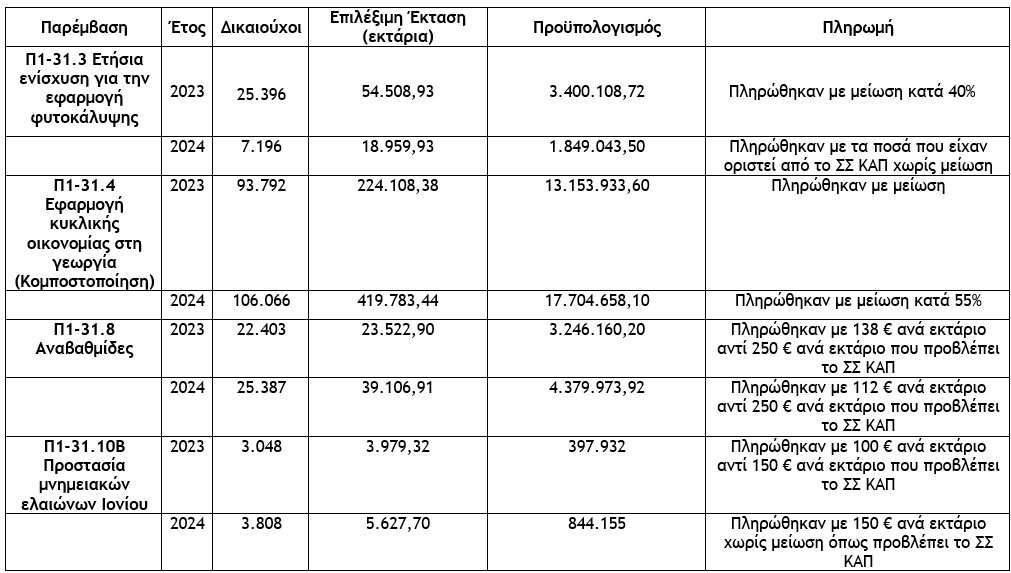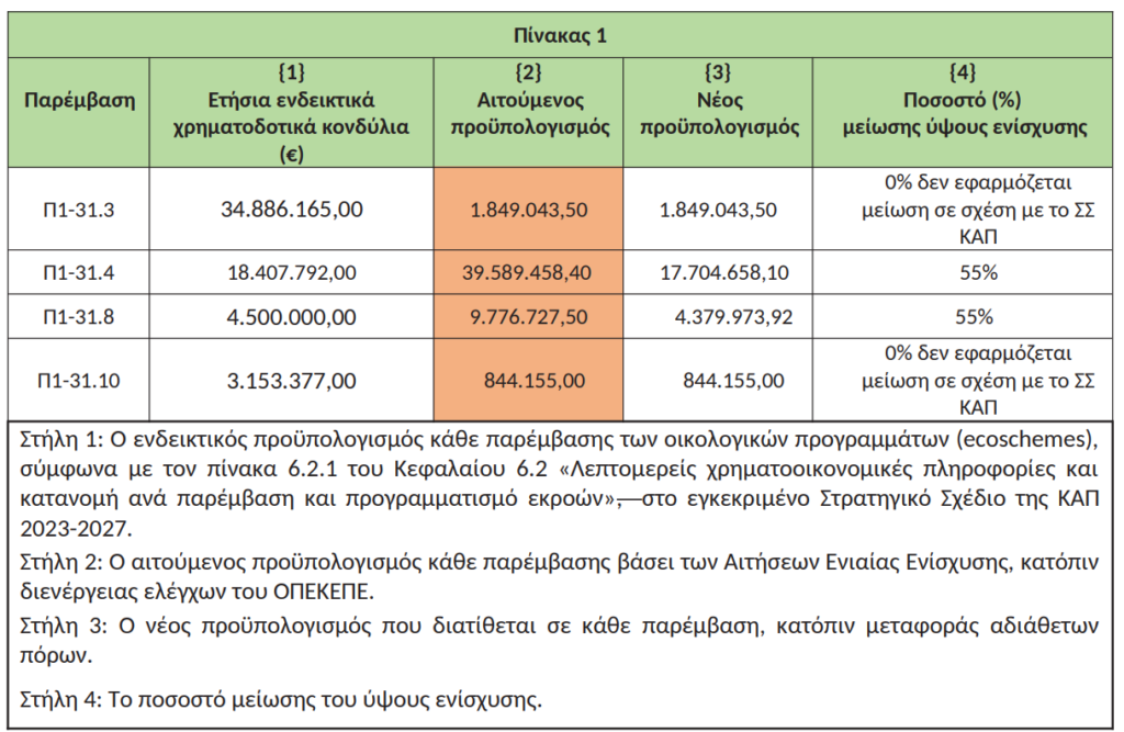 Συγκεκριμένα, για το έτος ενίσχυσης 2024, σε μία εκ των αποφάσεων περιλαμβάνονται τα ποσά ενίσχυσης (μοναδιαία ποσά) των παρεμβάσεων Π1-31.3 «Εφαρμογή βελτιωμένων πρακτικών φυτοκάλυψης, με παράλληλη ενίσχυση της βιοποικιλότητας», Π1-31.4 «Επέκταση κυκλικής οικονομίας στη γεωργία», Π1-31.8 «Διατήρηση και προστασία καλλιεργειών σε εκτάσεις με αναβαθμίδες» και Π1-31.10 «Προστασία τοπίων και γεωργικών συστημάτων υψηλής περιβαλλοντικής σημασίας». Σύμφωνα με την απόφαση, το ποσοστό μείωσης του ύψους ενίσχυσης, βάση του αιτούμενου και του νέου προϋπολογισμού ανά παρέμβαση, κατόπιν μεταφοράς πόρων και μη ύπαρξης αδιάθετων πόρων, στις περιπτώσεις υπερβάλλουσας ζήτησης, σύμφωνα με το υπ’ αρ. 22773/27.03.2025 έγγραφο του ΟΠΕΚΕΠΕ για το έτος ενίσχυσης 2024, διαμορφώνεται σύμφωνα με τη στήλη 4 του Πίνακα 1.