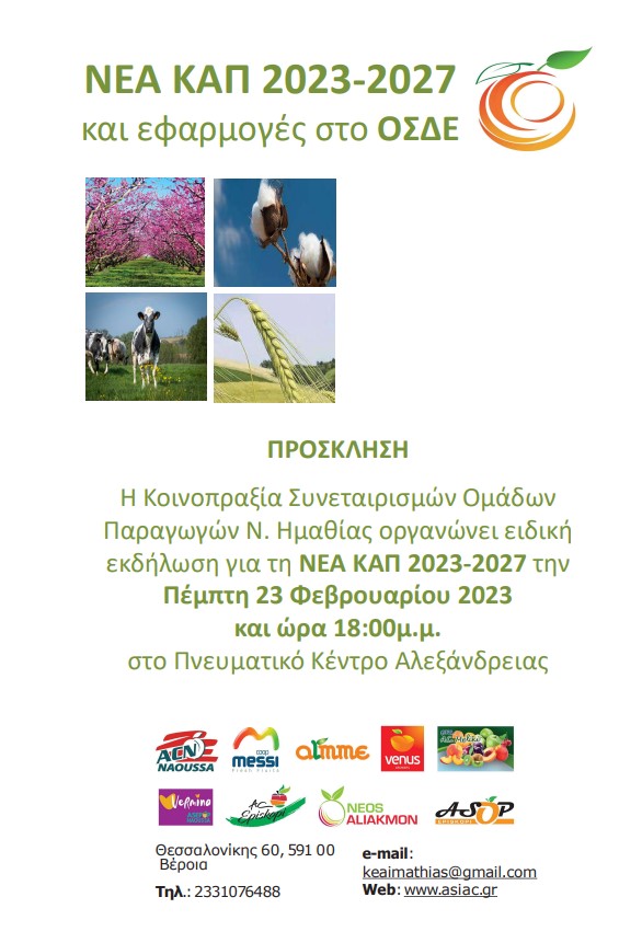 εκδήλωση για τη ΝΕΑ ΚΑΠ 2023-2027 και εφραμογές στο ΟΣΔΕ την Πέμπτη 23 Φεβρουαρίου 2023 και ώρα 18:00μ.μ. στο Πνευματικό Κέντρο Αλεξάνδρειας.
