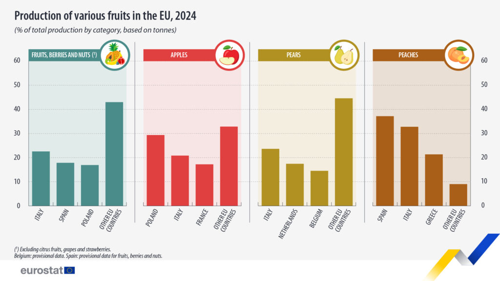 Το 2024, η παραγωγή φρούτων, μούρων και ξηρών καρπών (εξαιρουμένων των εσπεριδοειδών, των σταφυλιών και των φραουλών) στην ΕΕ ανήλθε σε 24,3 εκατ. τόνους, καταγράφοντας μείωση 2% σε σχέση με το 2023. Οι κύριες παραγωγές προήλθαν από την Ιταλία (5,4 εκατ. τόνοι), την Ισπανία (4,3 εκατ. τόνοι) και την Πολωνία (4,1 εκατ. τόνοι), χώρες που μαζί συγκέντρωσαν το 57% της συνολικής παραγωγής της ΕΕ.