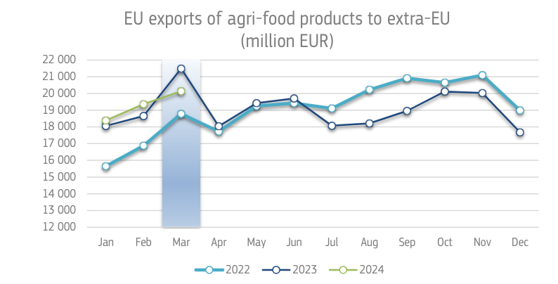 Τον Μάρτιο του 2024, το εμπορικό πλεόνασμα της ΕΕ στον αγροδιατροφικό τομέα ανήλθε σε 6,7 δισεκατομμύρια ευρώ, σημειώνοντας αύξηση 8% από τον προηγούμενο μήνα και 3% υψηλότερο από τον Μάρτιο του 2023. Οι εξαγωγές αυξήθηκαν κατά 4% στα 20,1 δισ. ευρώ, κυρίως λόγω των αυξημένων τιμών για ελιές και ελαιόλαδο.