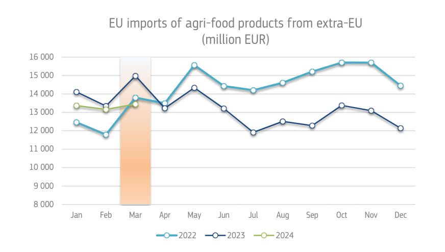 Οι εισαγωγές αγροδιατροφικών προϊόντων της ΕΕ ανήλθαν σε 13,5 δισεκατομμύρια ευρώ τον Μάρτιο, σημειώνοντας αύξηση 2% από τον προηγούμενο μήνα, αλλά 10% χαμηλότερη από τον Μάρτιο του 2023, κυρίως λόγω των μειωμένων όγκων εισαγωγής.