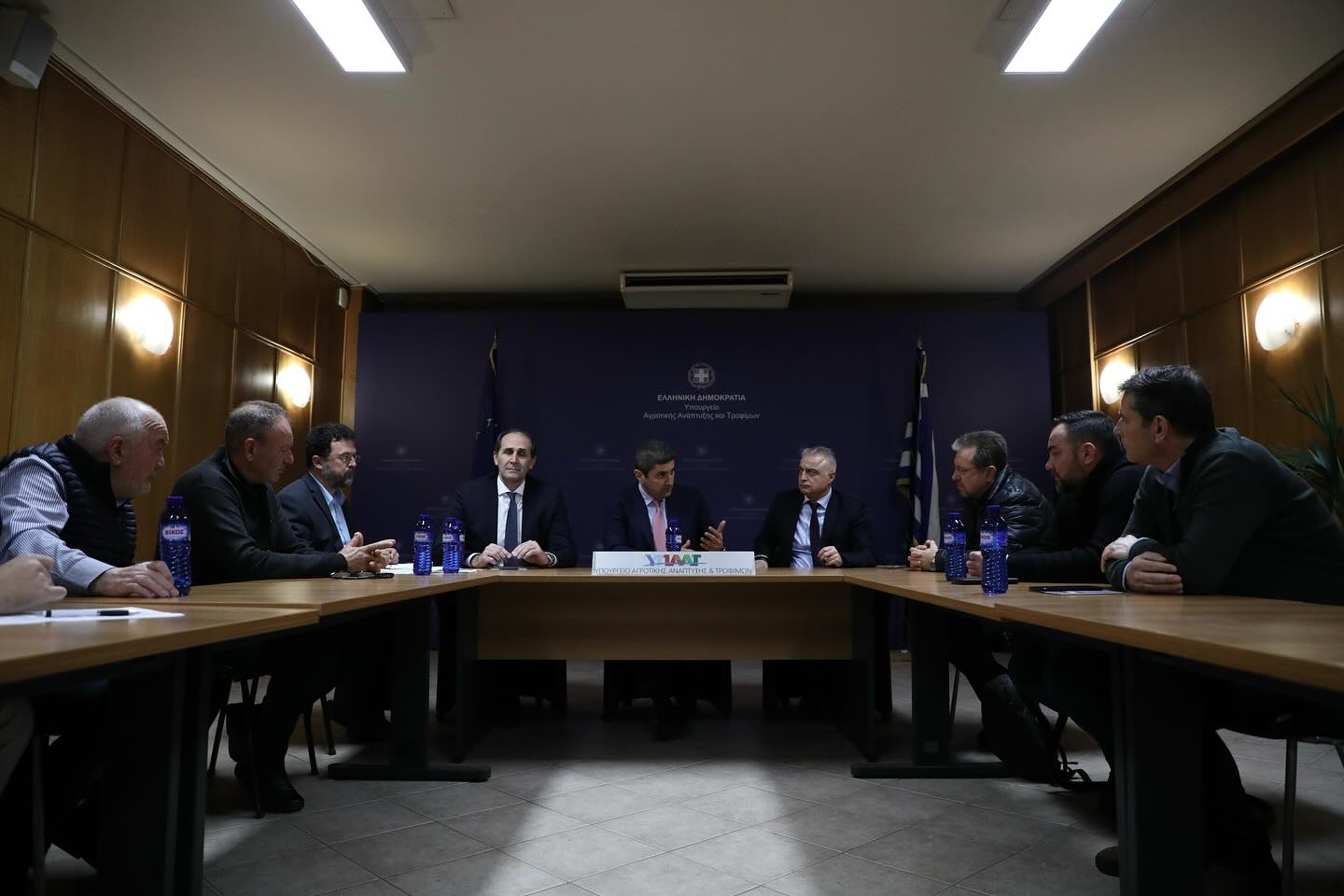 «Ο διάλογος με τους αγρότες και τους κτηνοτρόφους συνεχίζεται, οι πόρτες μας παραμένουν ανοιχτές», τόνισε ο ΥπΑΑΤ Λευτέρης Αυγενάκης στη σύσκεψη που είχε, παρουσία των αρμόδιων υφυπουργών Σταύρου Κελέτση και Διονύση Σταμενίτη και του ΓΓ Αγροτικής Ανάπτυξης Γιώργου Στρατάκου, με εκπροσώπους αγροτών και κτηνοτρόφων, από τα Κουφάλια και τη Χαλάστρα Θεσσαλονίκης, τις Σέρρες, τη Λάρισα, τη Χαλκιδική, την Ορεστιάδα και την Ημαθία. Τους εκπροσώπους των αγροτικών συνεταιρισμών της Ημαθίας συνόδευαν οι βουλευτές Απόστολος Βεσυρόπουλος και Λάζαρος Τσαβδαρίδης.