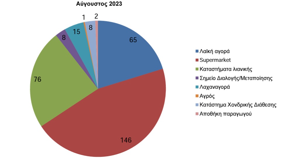Διάγραμμα 2. Κατανομή των σημείων δειγματοληψίας που αφορά τους ελέγχους της εσωτερικής αγοράς για το μήνα Αύγουστο 2023.